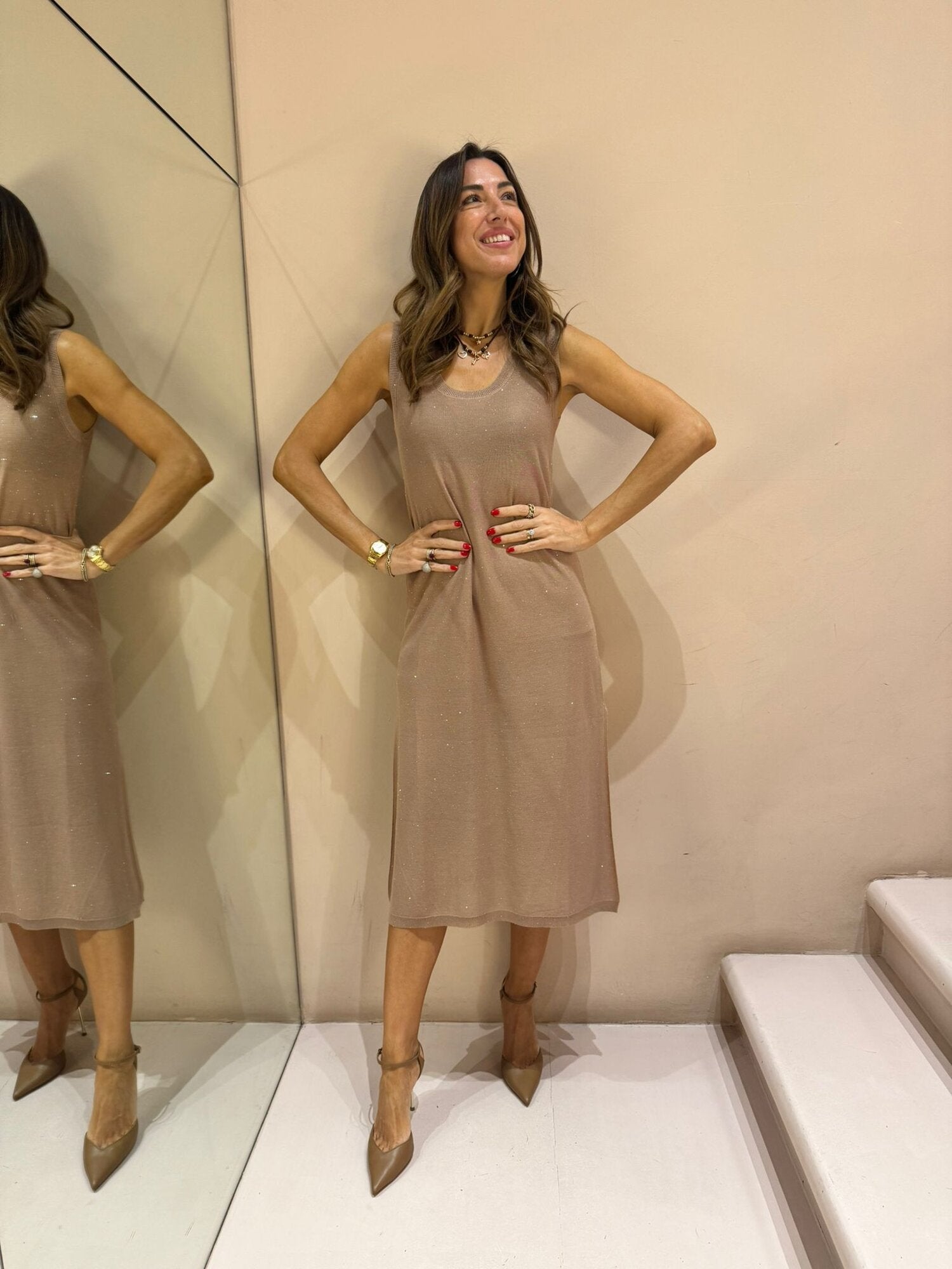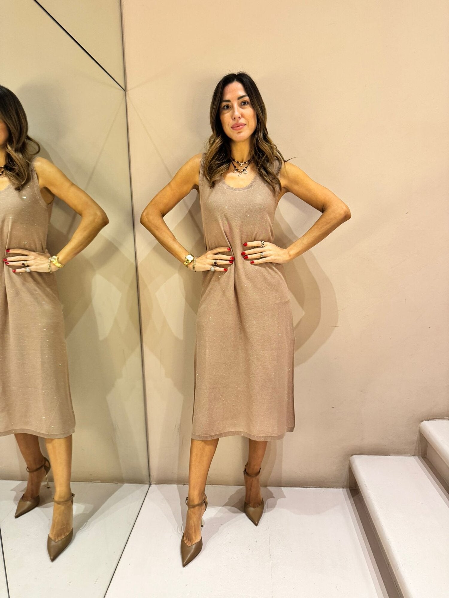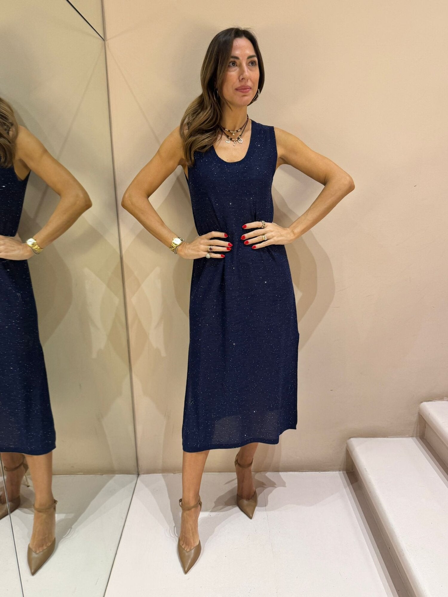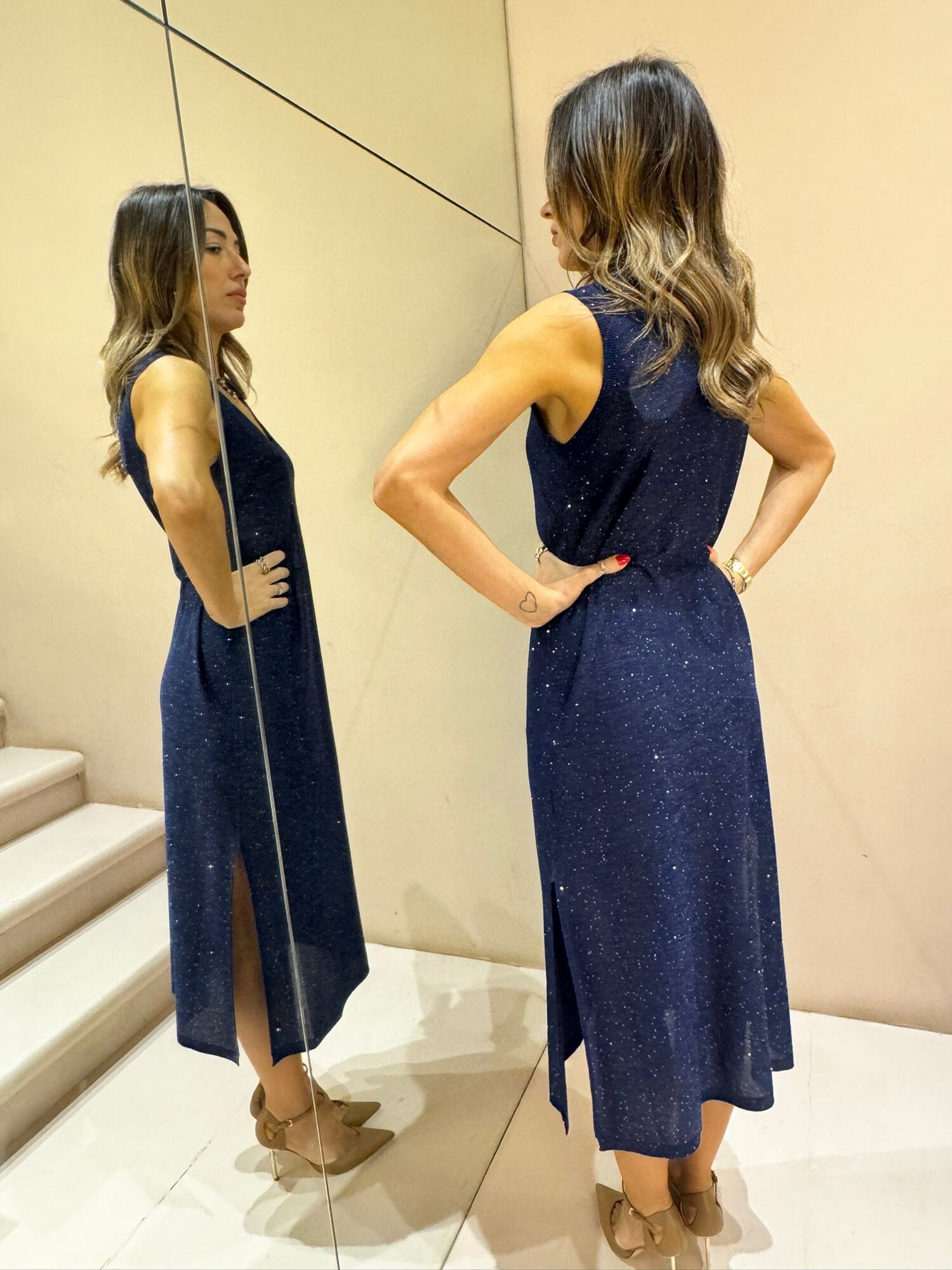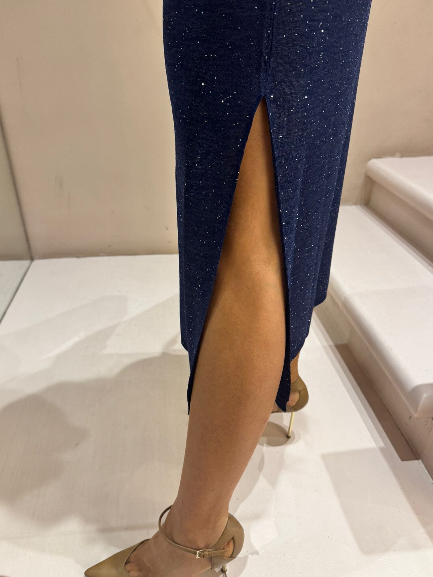 ABITO SMANICATO IN VISCOSA E MICRO PAILLETTES, SPACCHI SULLA PARTE FINALE