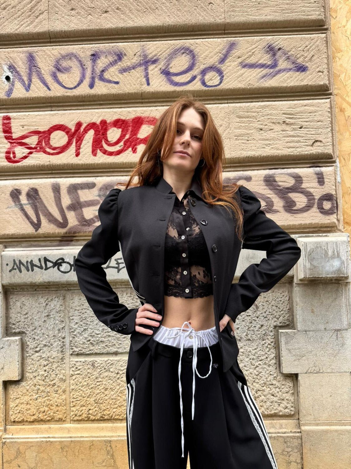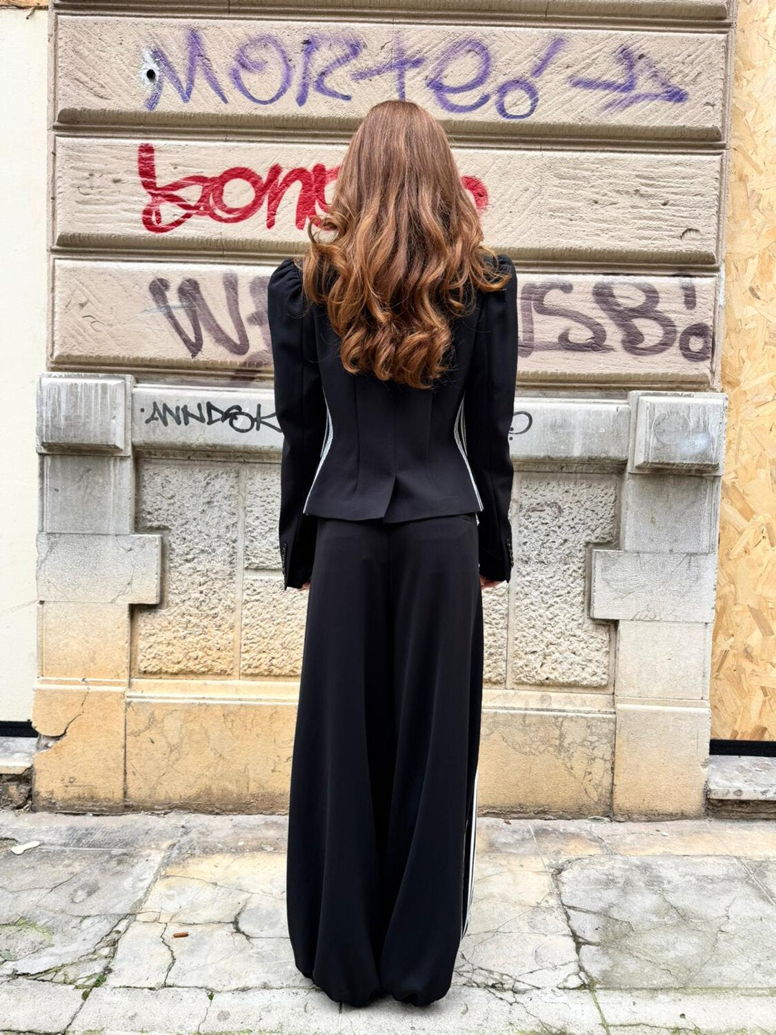 Giacca sfiancata con collo alla coreana e spalle a palloncino