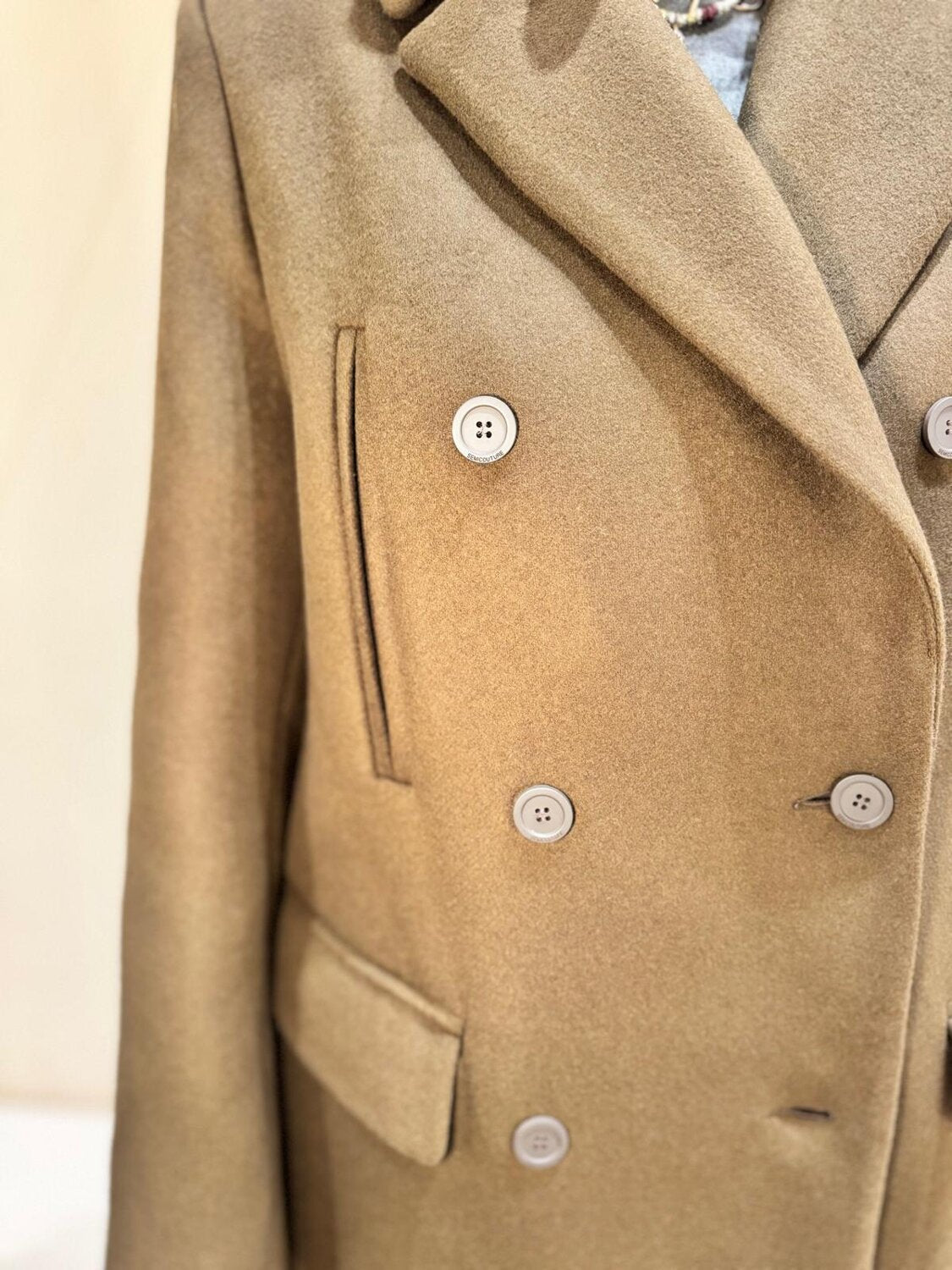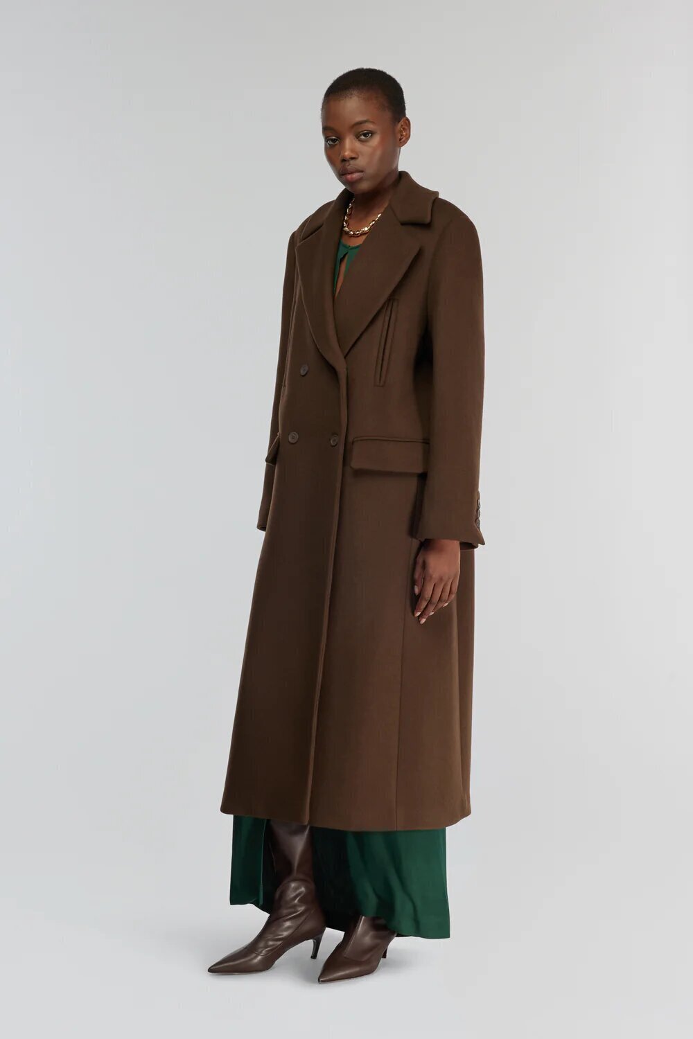 Cappotto in panno unito. Abbottonatura frontale doppio petto. Due tasche doppio filetto e due tasche con patta. Vestibilità over e lunghezza sotto ginocchio