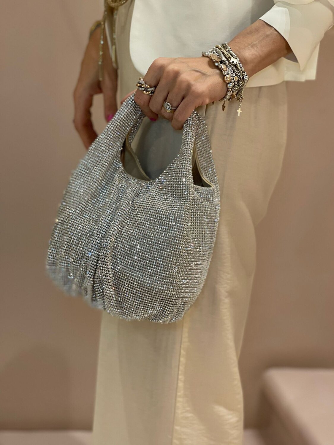 Borsa a mano con cristallo dotata di tracolla interna amovibile perfetta per rendere il tuo stile unico