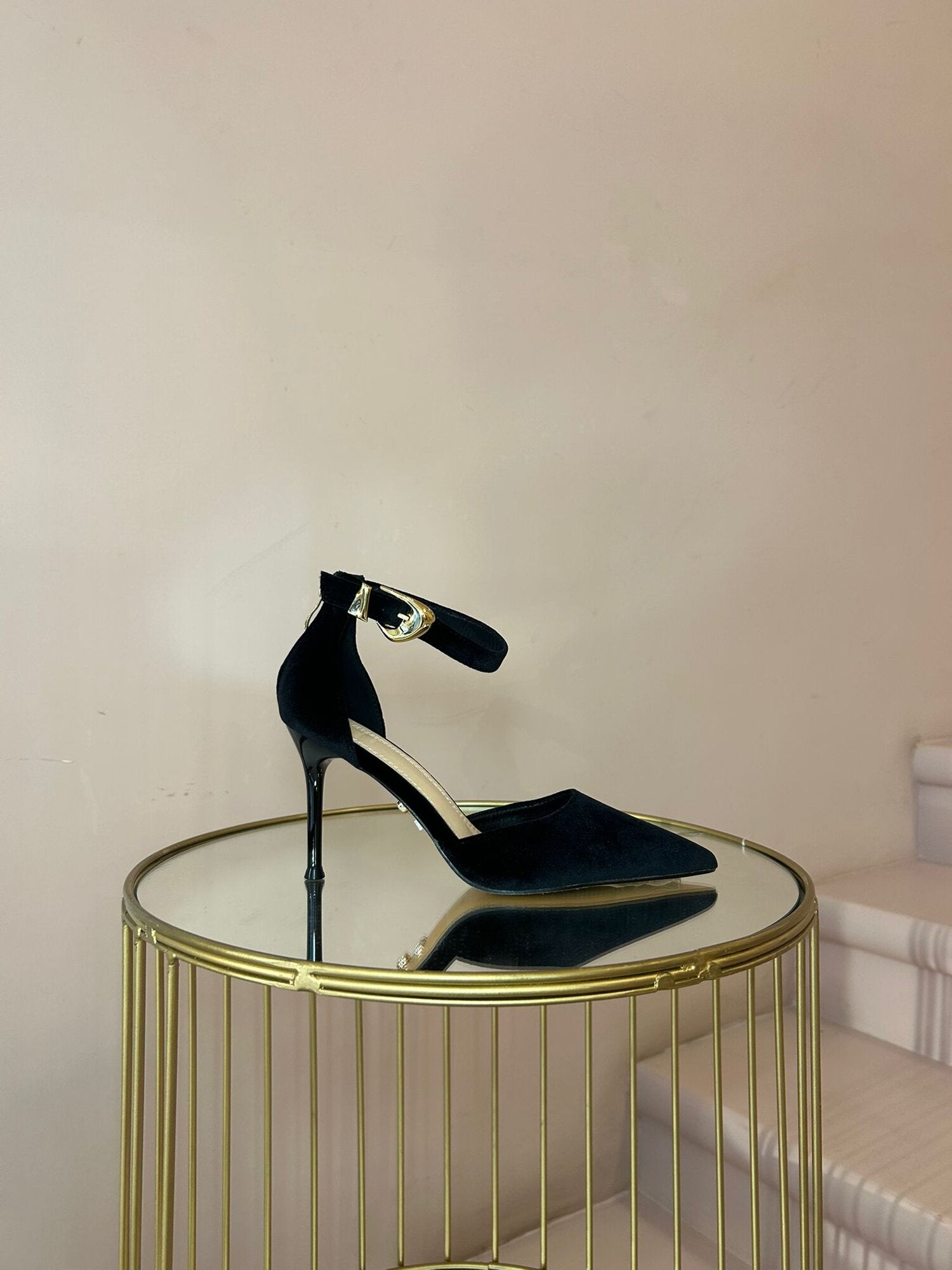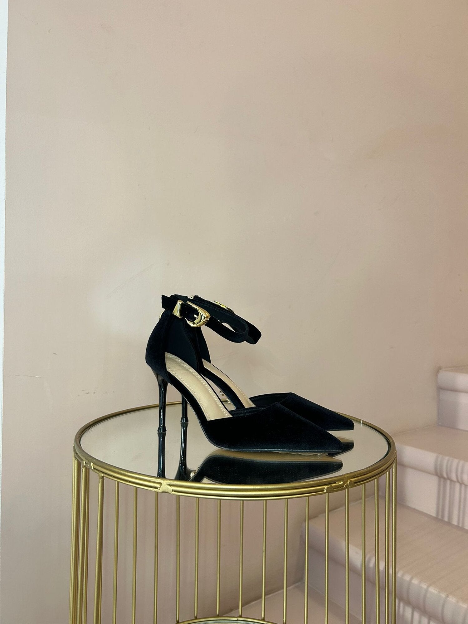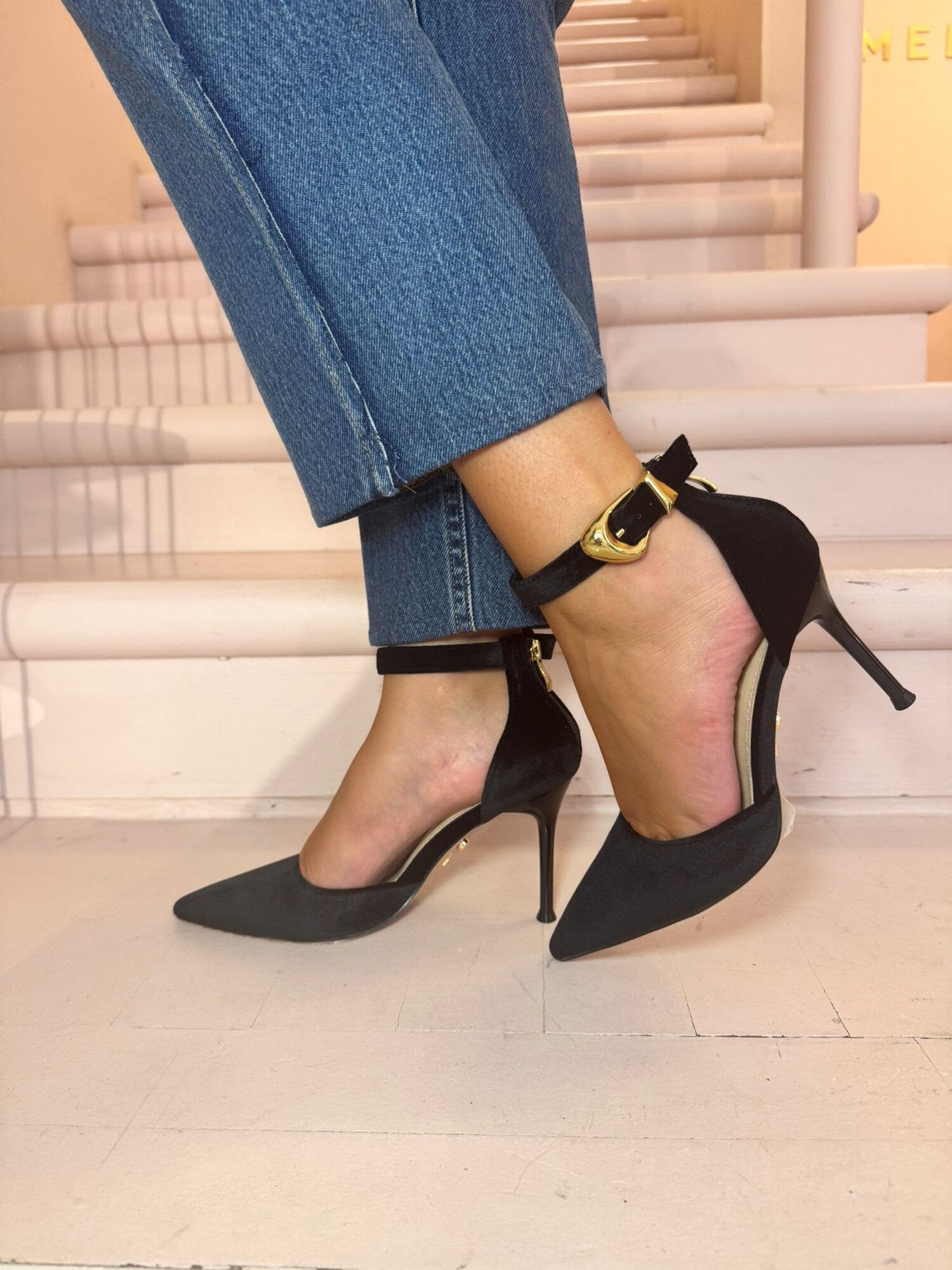 Scarpa in velluto tacco 10 zip tallone e fibia oro
