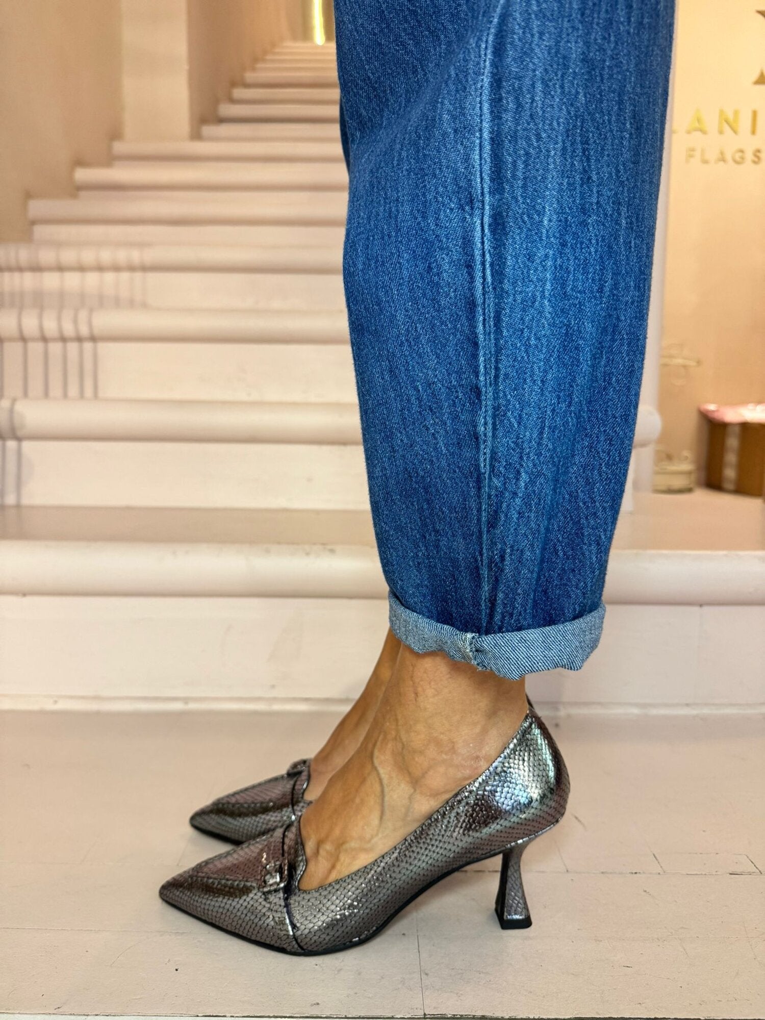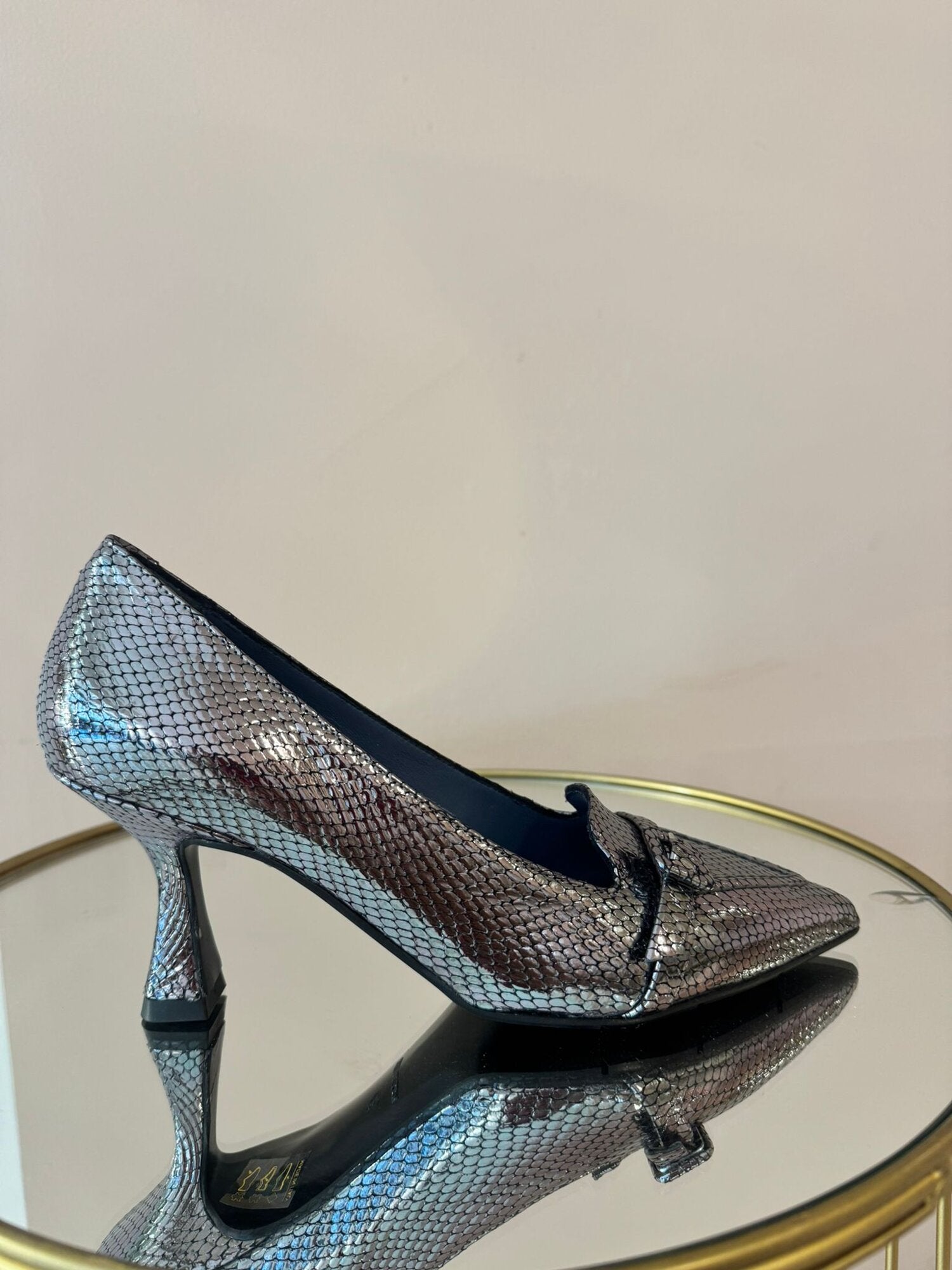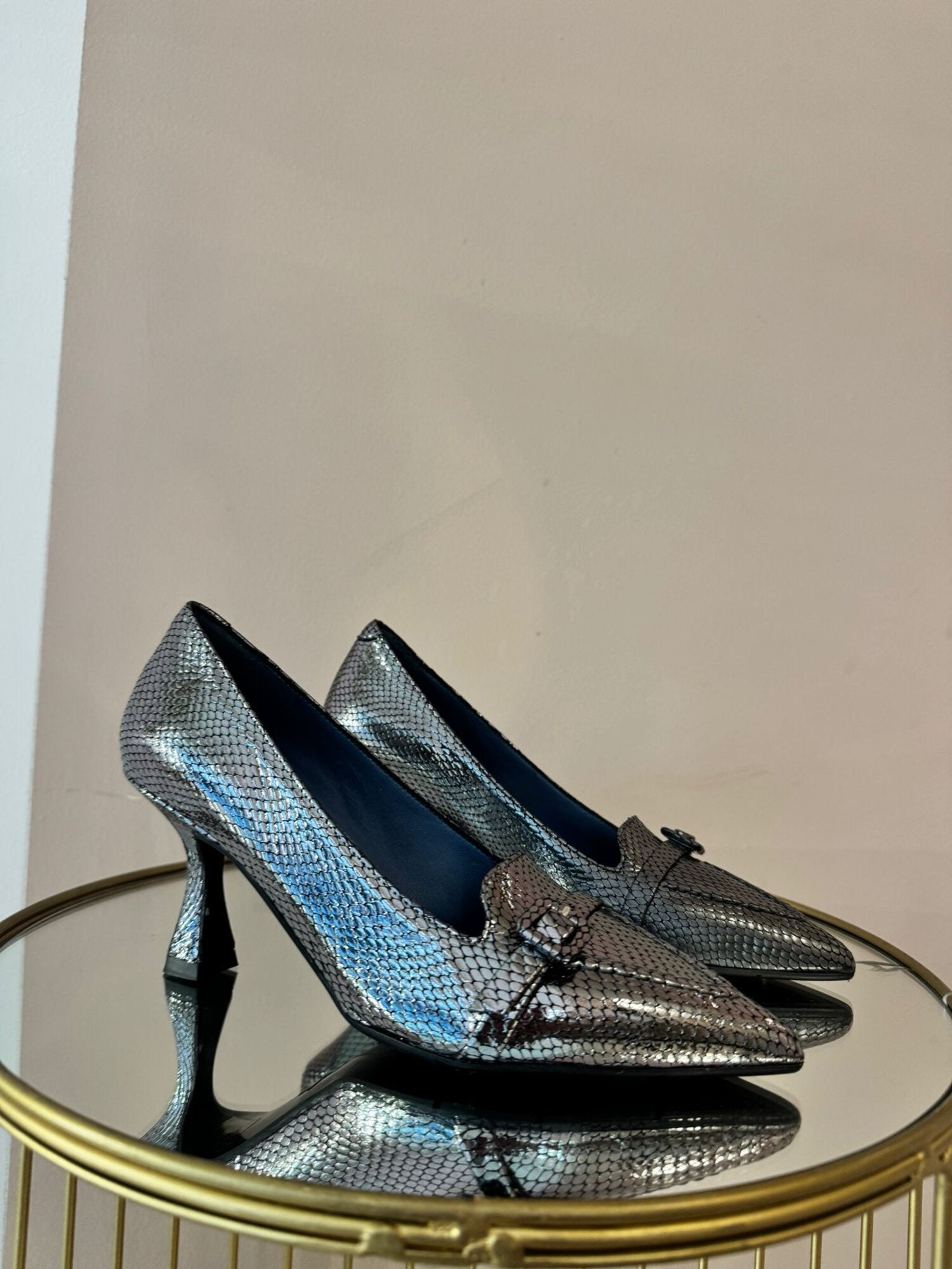 DECOLLETE IN PELLE EFFETTO SNAKE CON FIBBIA COLORE ACCIAIO,TACCO 70CM
