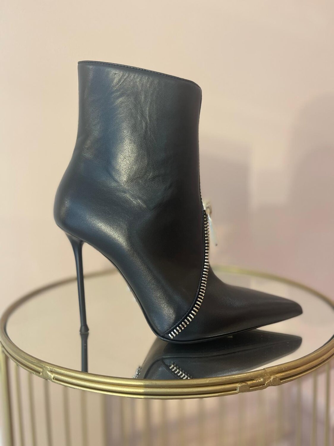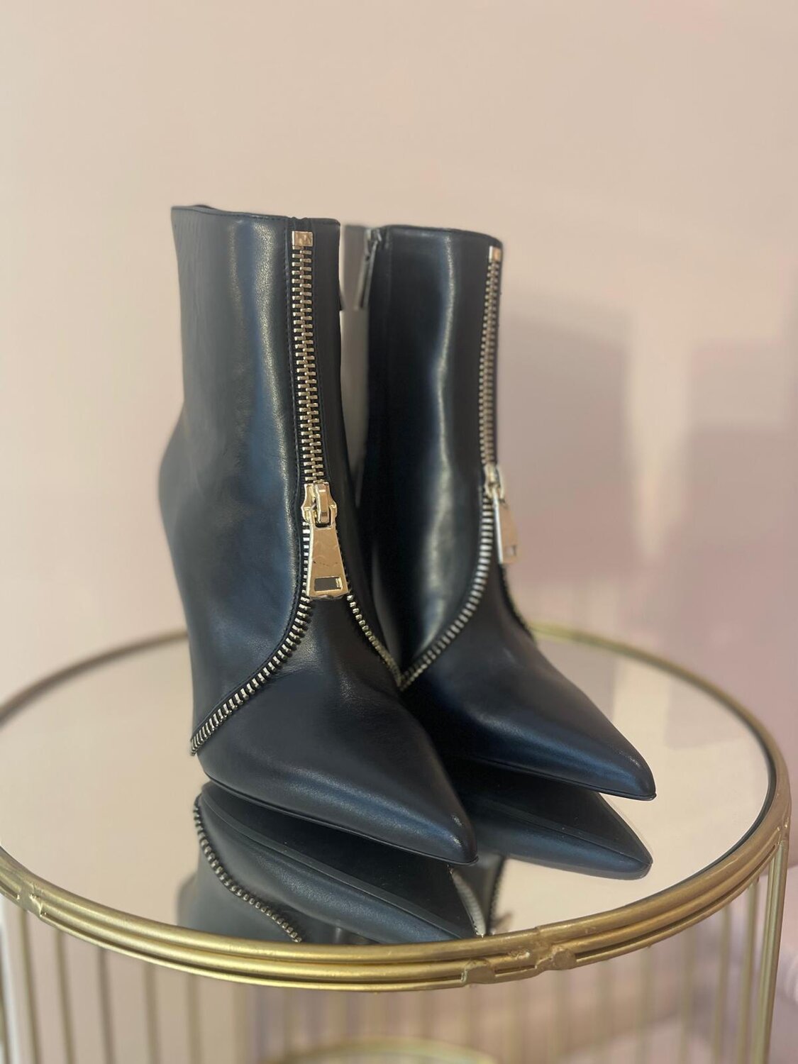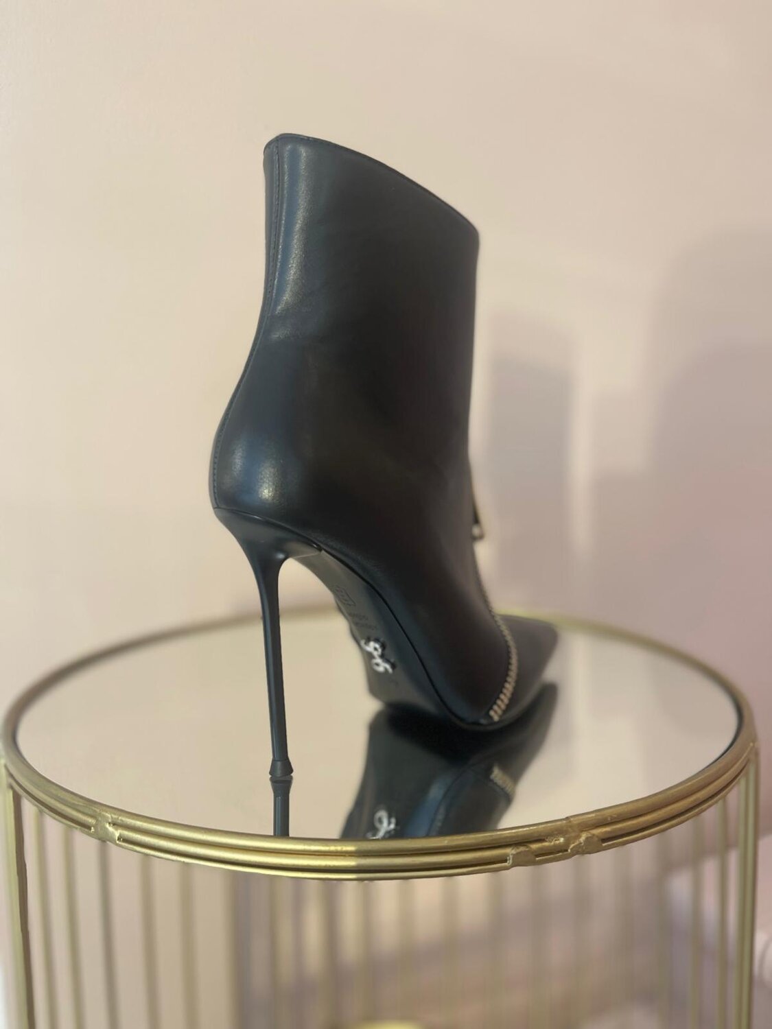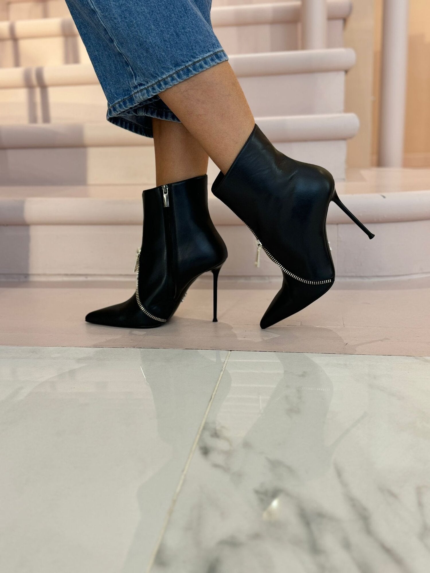 TRONCHETTO IN VERA PELLE CON TACCO A STILETTO, DECORATO CON FINTA ZIP IN ORO SULLA TOMAIA. LAVORAZIONE ITALIANA ARTIGIANALE, SUOLA IN CUOIO CON ANTISCIVOLO