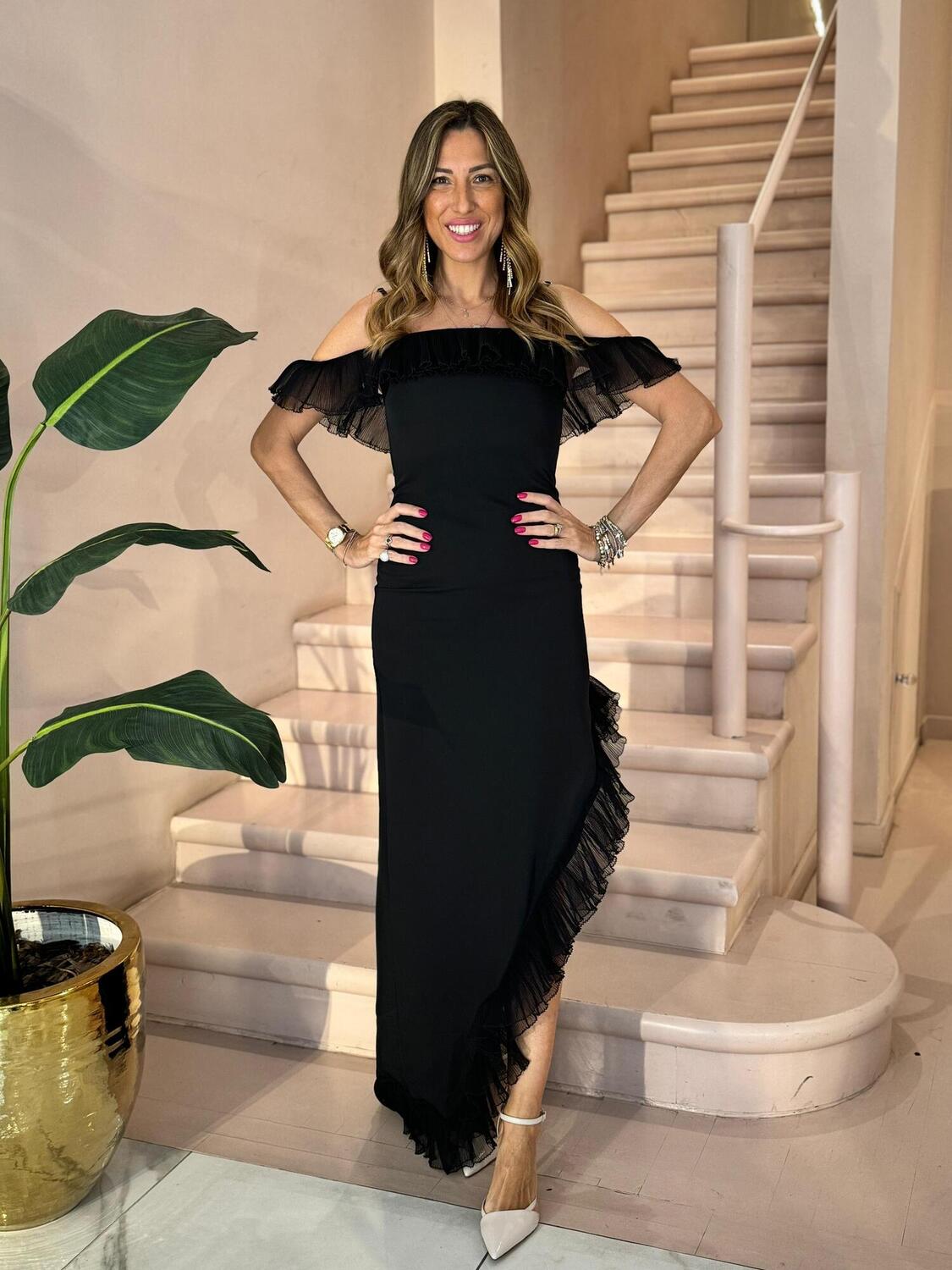 Tubino arricchito da rouches sul decollete che si pogiano sul braccio creando una manichetta, modello con gonna asimmetrica che crea un gioco di spacchi