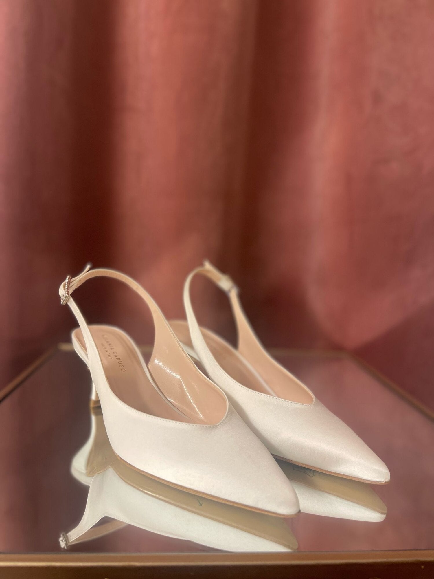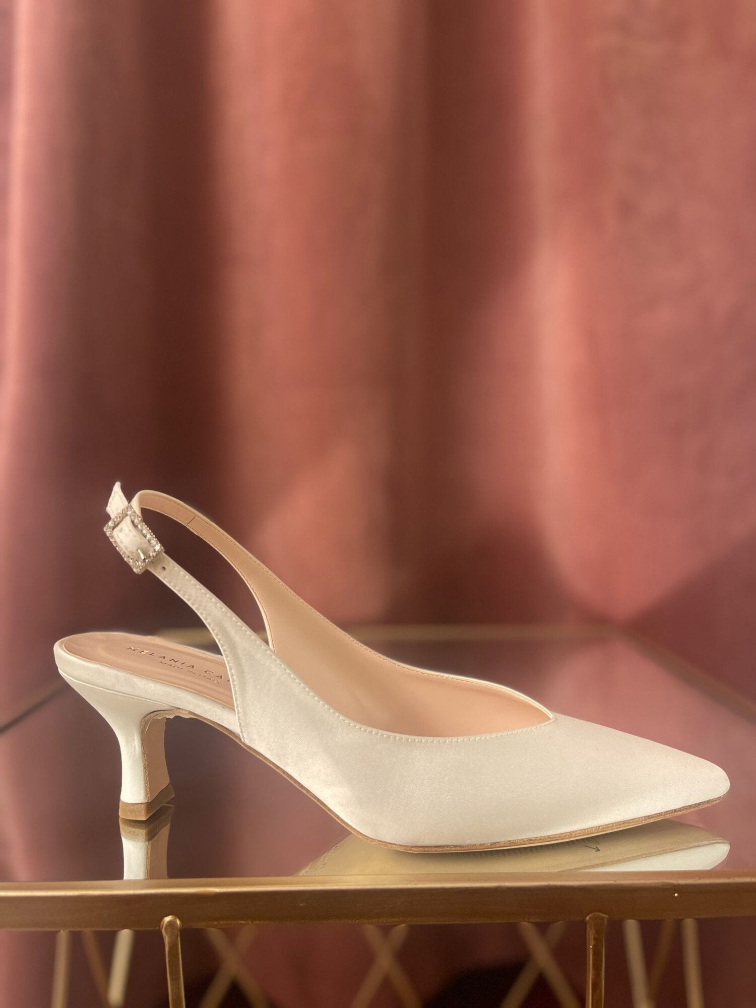 CHANEL IN RASO DI SETA ESTERNAMENTE E PELLE INTERNAMENTE, SUOLA IN CUOIO, SCOLLO A CUORE, FIBBIA CON STRASS E TACCO A ROCCHETTO ALTO 5 CM