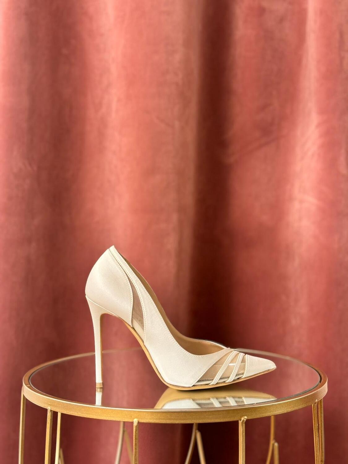 Decollete in satin bianco seta pura con disegno sulla punta e sul laterale rete trasparente