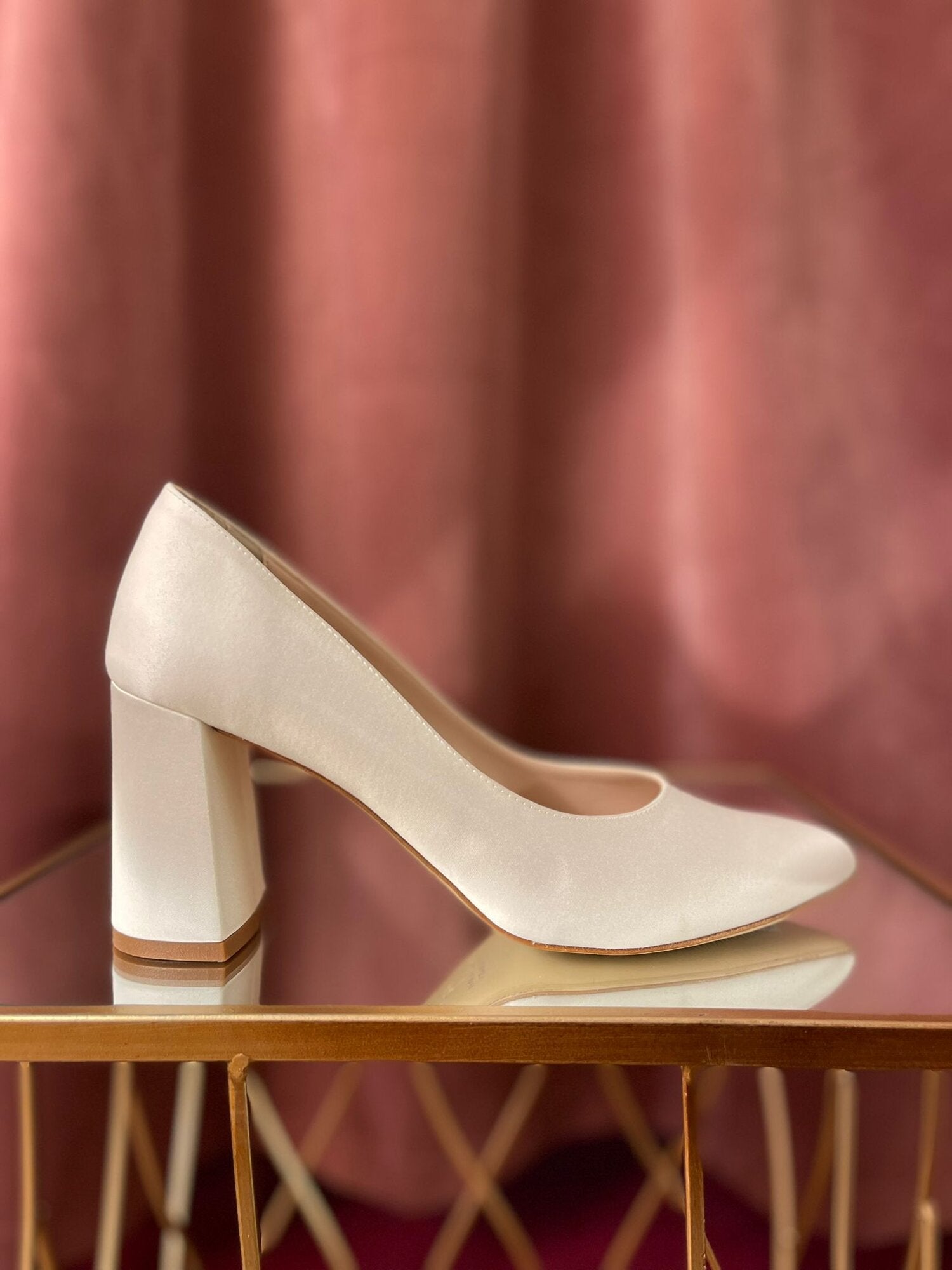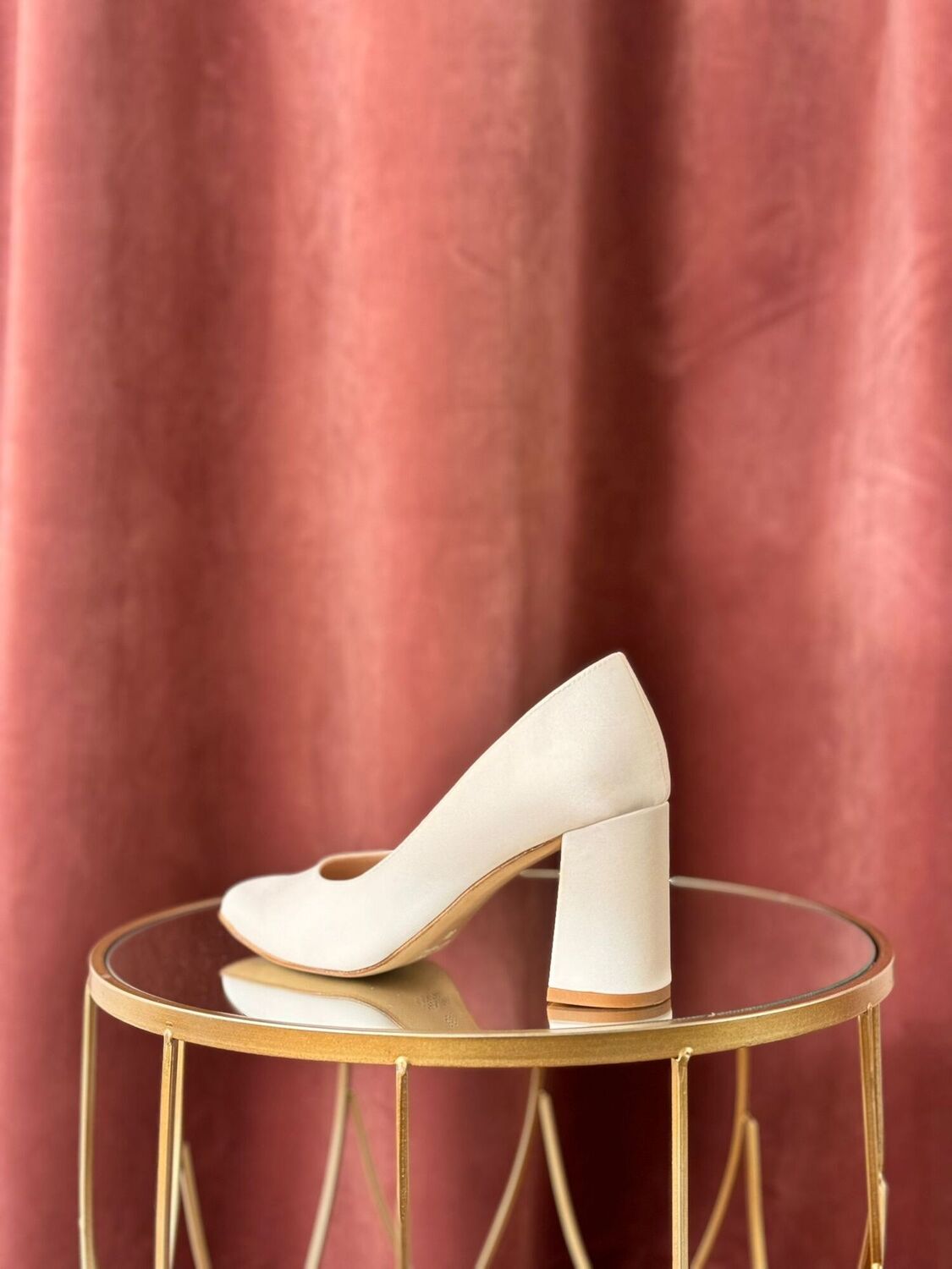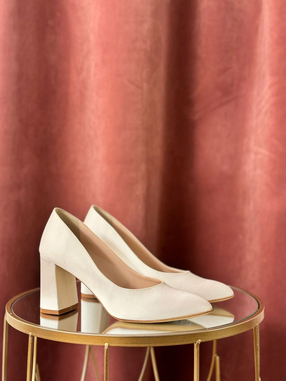 Decollete in raso di seta con tacco grosso, fondo cuoio, lavorazione artigiale.